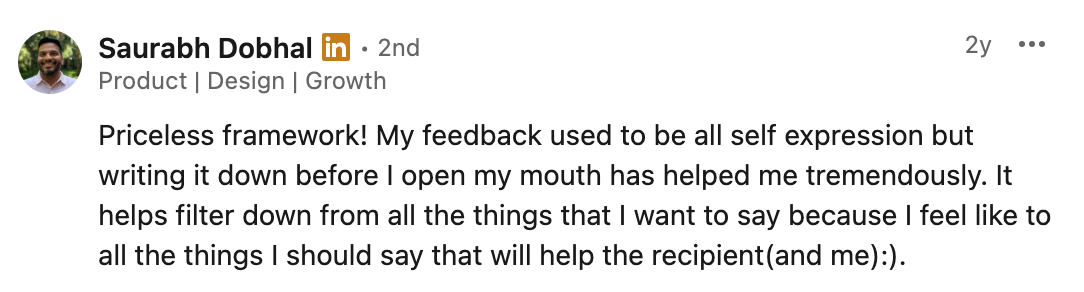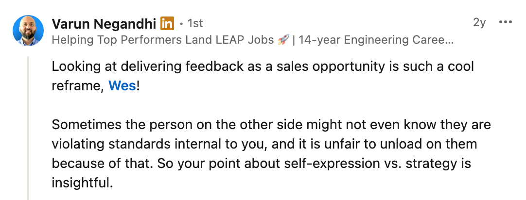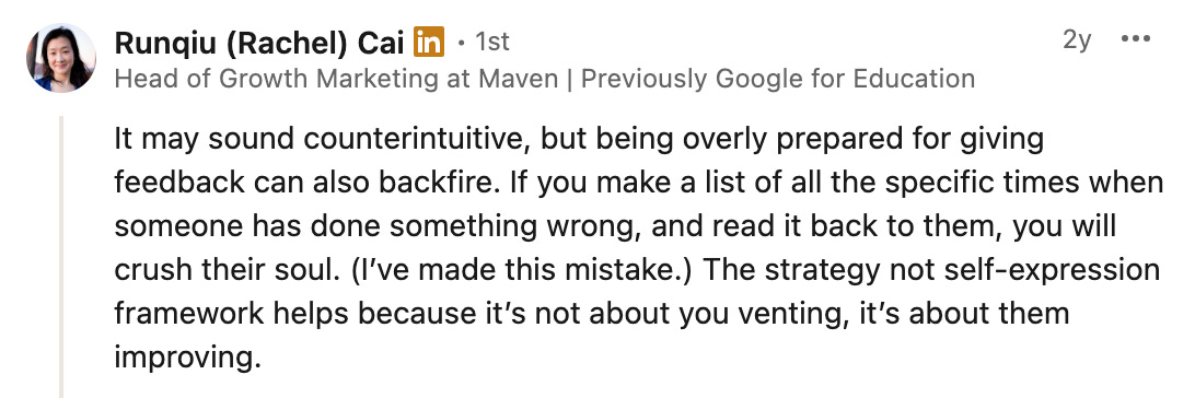 Originally, I wrote the post through the lens of giving feedback. But I’ve come to realize that “strategy, not self-expression” is so much more broadly applicable. It basically applies to anytime you want to sell any idea, to anyone.
